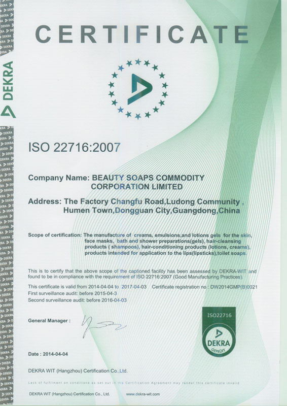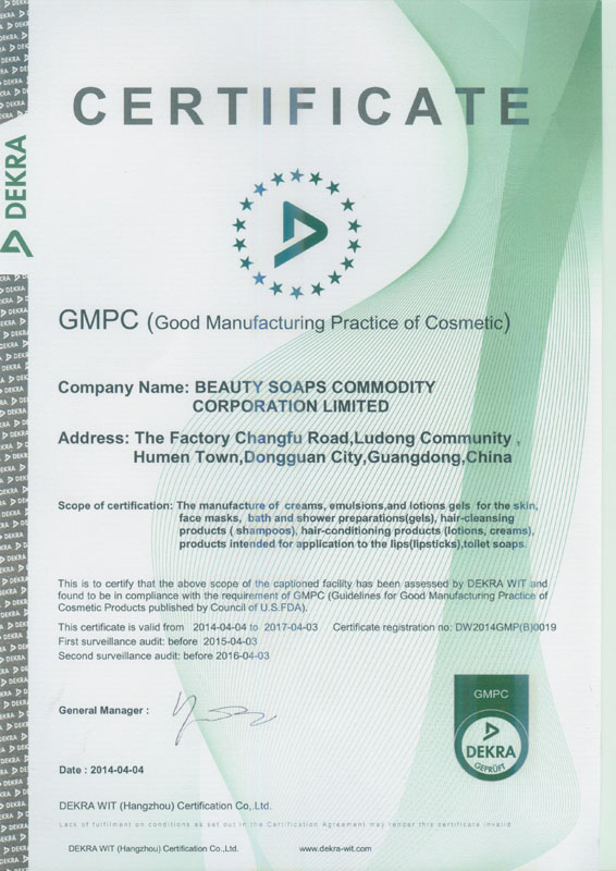 工廠通過了ISO22716:2007 及GMPC 質量體系認證并獲頒ISO22716:2007和GMPC證書,遵循ISO相關體系及GMPC質量體系運作。
